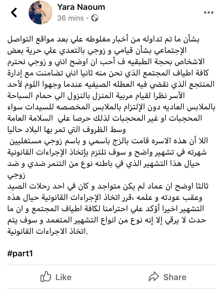 بحسب السيدة بأن الأمر لم ينته عند ذلك، إذ فوجئت بتدخل سيدة، وهي زوجة لاعب كرة قدم سابق، اكتفت بذكر الحروف الأولى من اسمها "ي. ن" كانت برفقة والدتها: "نزلت البنت بالبوركيني وكنت معتقدة القصة انتهت فجأة جت (ي) اتهجمت عليا في البول وبتقولي.. أنتي يا بنتي هبلة أنتي عارفة أنتي بتعندي مع مين.. لو مش عارفة أنك فريزورت محترم مينفعش تنزلي فيه شغالتك روحي بيها بلطيم.. أنا مش هنزل مكانها".
