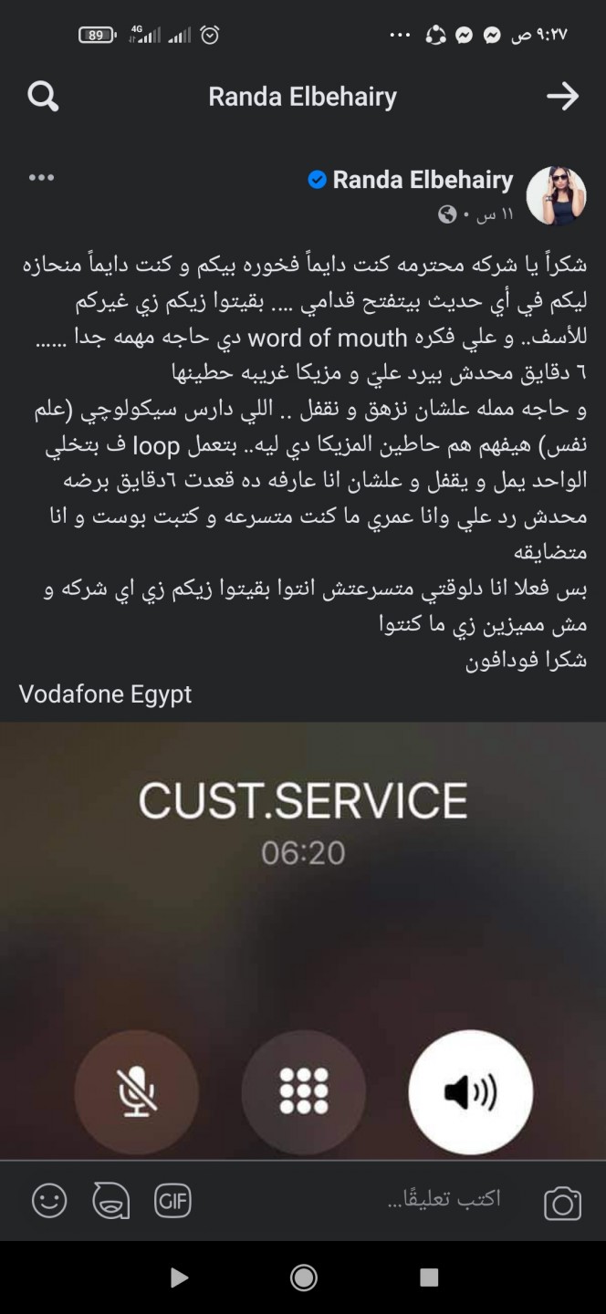 تابعت«اللي دارس سيكولوچي (علم نفس) هيفهم هم حاطين المزيكا دي ليه، بتعمل loop ف بتخلي الواحد يمل و يقفل و علشان انا عارفه ده قعدت ٦دقايق برضه محدش رد علي وانا عمري ما كنت متسرعه و كتبت بوست و انا متضايقه بس فعلا انا دلوقتي متسرعتش انتوا بقيتوا زيكم زي اي شركه و مش مميزين زي ما كنتوا».