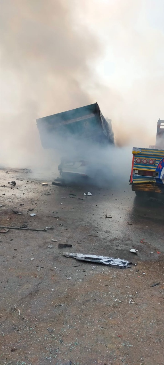 وأسفر الحادث عن مصرع شخص وإصابة 3 آخرين وتم نقل المتوفى والمصابين إلى المستشفى، فيما تقوم سيارتى إطفاء بإخماد الحريق الناتج عن تصادم السيارات بالمكان.