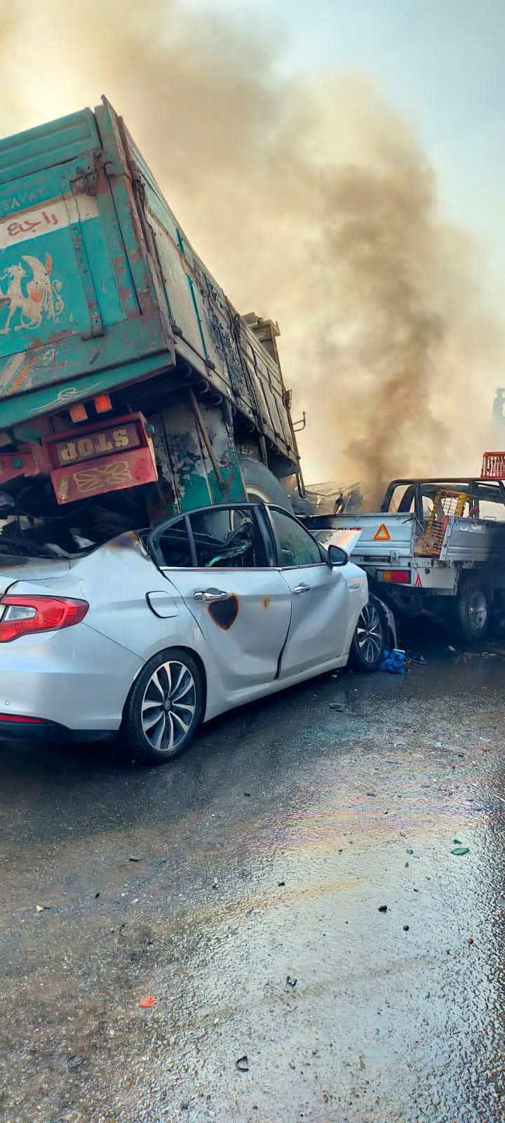 كما نتج عن الحادث اشتعال النيران في 4 سيارات، وتمت عملية الإخماد، وقامت إدارة المرور بغلق النفق بالكامل وإجراء تحويلة مرورية لحين إزالة حطام الحادث.