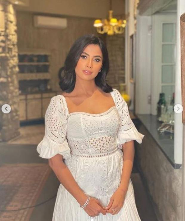 تألقت الفنانة روبي خلال جلسة التصوير بفستان أبيض، مُفرغ دون بطانة، جاء بنصف أكمام مروحية، قصير، واعتمدت على الشعر الليس القصير، مع المكياج الهادئ البسيط، دون أن ترفق أي تعليق على الصور.