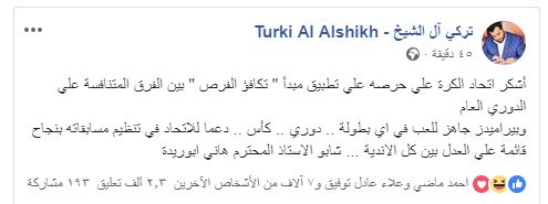 وكتب آل الشيخ عبر صفحته الرسمية على موقع التواصل الاجتماعي "فيس بوك": "أشكر اتحاد الكرة علي حرصه علي تطبيق مبدأ " تكافؤ الفرص " بين الفرق المتنافسة علي الدوري العام ".