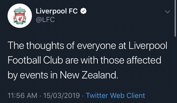 وغرد الحساب الرسمي للنادي على "تويتر" قائلاً: "نادي ليفربول لكرة القدم يُقدم التعازي لكل المتضررين في أحداث نيوزيلندا".