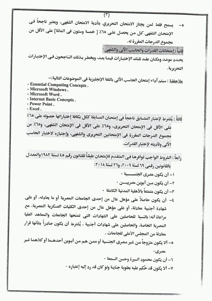 ويعقد الامتحان التحريري بدءا من يوم الأحد 25 أغسطس المقبل وحتي 28 أغسطس.