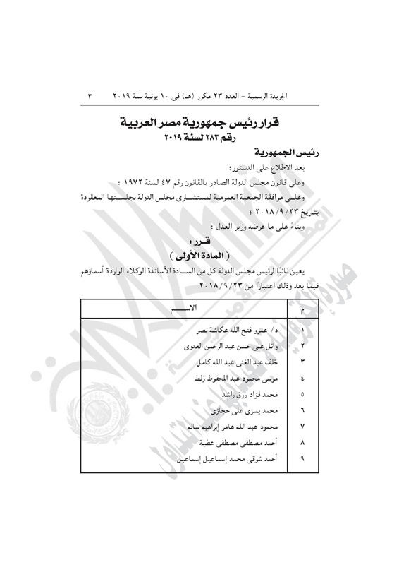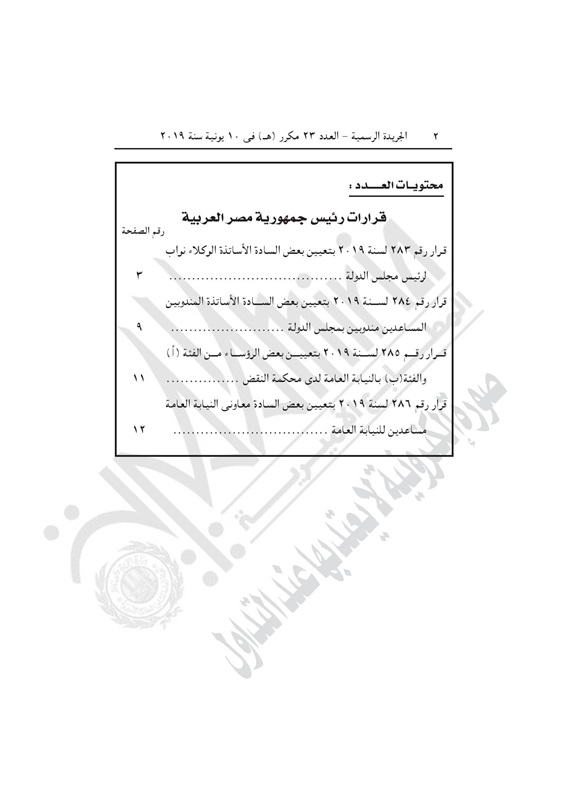 نشرت الجريدة الرسمية في عددها 23 مكرر (ه)، الصادر في 10 يونيو 2019، قرارات رئيس جمهورية مصر العربية أرقام 283 لسنة 2019، بتعيين بعض الوكلاء نواب لرئيس مجلس الدولة، و284 لسنة 2019، بتعيين بعض الأساتذة المندوبين المساعدين مندوبين بمجلس الدولة، و285 لسنة 2019، بتعيين بعض الرؤساء من الفئة (أ) والفئة (ب) بالنيابة العامة لدى محكمة النقض 286 لسنة 2019، بتعيين بعض السادة معاوني النيابة العامة مساعدين للنيابة العامة.