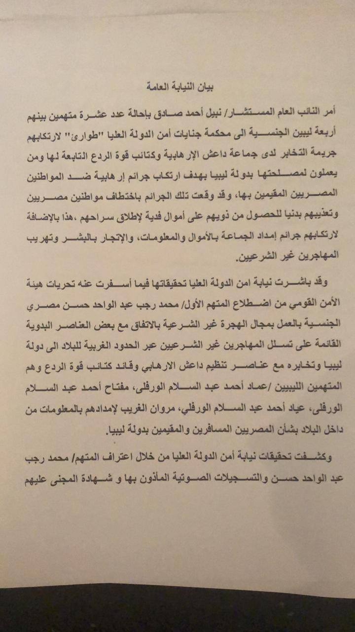 وتخابره مع عناصر تنظيم داعش الإرهابي وقائد كتائب قوة الردع، وهم المتهمين الليبيين (عماد أحمد عبد السلام الورفلي، ومفتاح أحمد عبد السلام الورفلي، وعياد أحمد عبد السلام الورفلي، ومروان الغريب) لإمدادهم بالمعلومات من داخل البلاد بشأن المصريين المسافرين والمقيمين بدولة ليبيا.