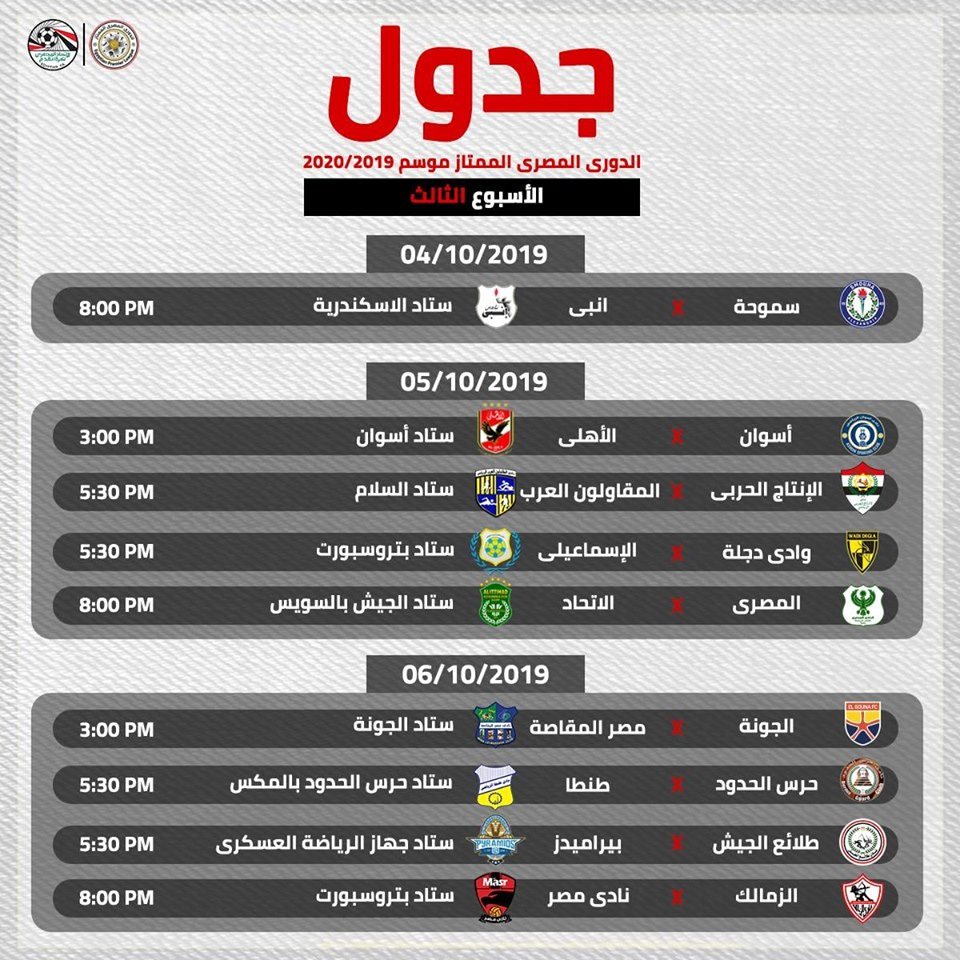 ويحل الزمالك في المباراة الافتتاحية أمام سموحة في 23 من سبتمبر الحالي على ستاد بتروسبورت، كما تقرر أن يستضيف ستاد القاهرة مباراة القمة بين الأهلي والزمالك بالجولة الرابعة في التاسع عشر من أكتوبر المقبل، في تمام الساعة الثامنة مساء.