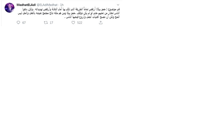 وقال "العدل" في تغريدته: "في موضوع (حمو بيكا) أرفض تمامًا الطريقة التي تكلم بها أمام النقابة وأرفض تهديداته، لكن دعوا الناس تختار من تحبهم حتى لو لم يكن ذوقكم. حمو بيكا ومن هم مثله نتاج مجتمع نعيشه بالفعل، والحل ليس المنع ولكن أن نصنع أغنيات أجمل وأروع فيحبها الناس".