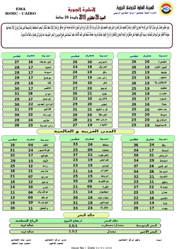 أعلنت هيئة الأرصاد الجوية ، أن طقس اليوم السبت، معتدل على شمال البلاد حتى القاهرة والوجه البحري، وشمال الصعيد ، مائل للحرارة على جنوب الصعيد نهارا، مائل للبرودة ليلا.