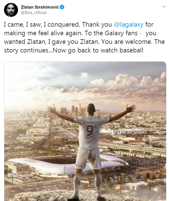 وكتب زلاتان عبر حسابه الرسمي على موقع التواصل الاجتماعي "تويتر": "لقد أتيت ورأيت وتفوقت؛ شكرًا لوس أنجلوس جالاكسي لإعادة الحياة لي؛ ولجماهير جالاكسي لقد أردتم زلاتان وأعطيته لكم؛ مرحبًا بكم؛ الآن سأعود لمشاهدة البيسبول".