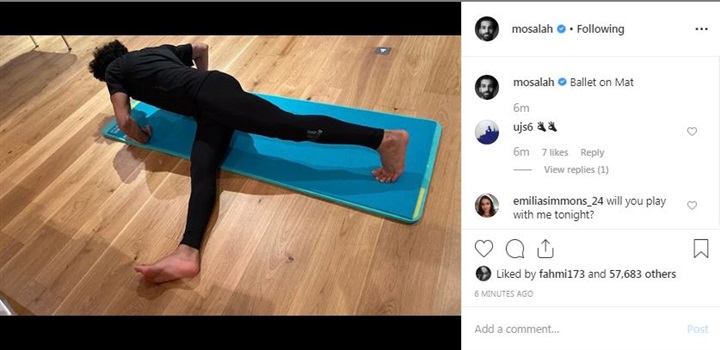 وظهر "صلاح" في الصورة وهو يمارس التمارين الرياضية مرتديًا تيشرت وبنطلون باللون الأسود، معلقًا عليها قائلًا: "Ballet on Mat"، ونالت إطلالته إعجاب الآلاف من متابعيه.