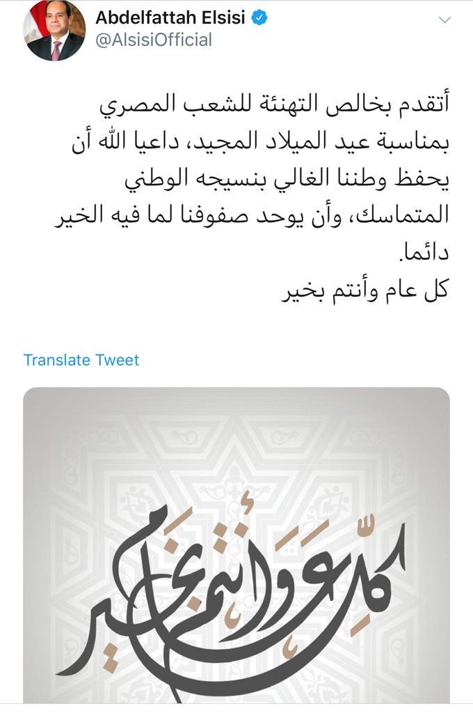 تقدم الرئيس عبد الفتاح السيسى بخالص التهنئة للشعب المصرى بمناسبة عيد الميلاد المجيد ، وكتب الرئيس عبد الفتاح السيسي عبر حسابه الرسمى بموقع التدوينات القصيرة " تويتر " :"أتقدم بخالص التهنئة لـ الشعب المصرى بمناسبة عيد الميلاد المجيد ، داعيا الله أن يحفظ وطننا الغالى بنسيجه الوطنى المتماسك، وأن يوحد صفوفنا لما فيه الخير دائما.