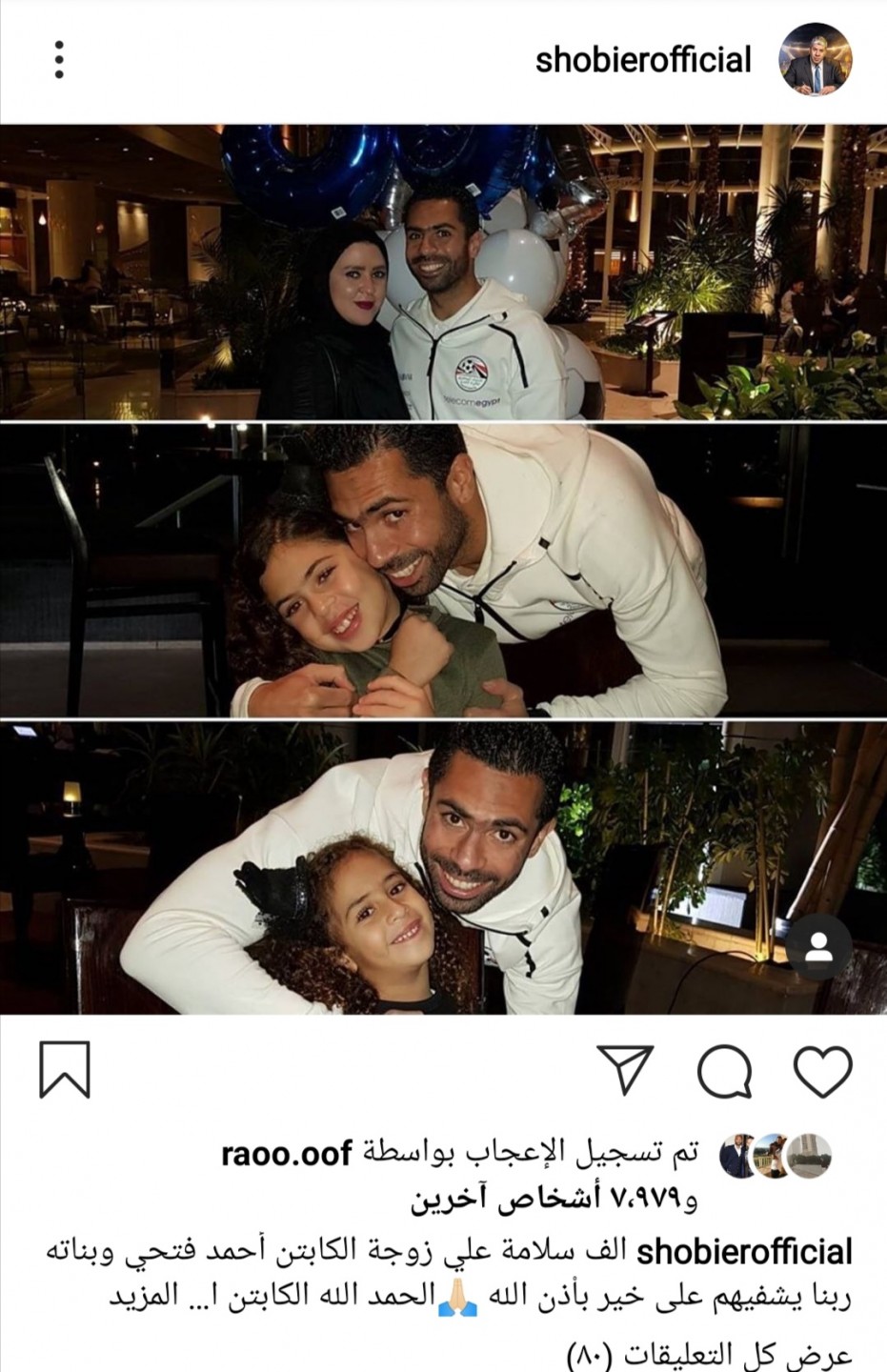 وكتب شوبير عبر حسابه الرسمي على موقع التواصل الاجتماعي "إنستجرام": "ألف سلامة علي زوجة الكابتن أحمد فتحي وبناته ربنا يشفيهم على خير باْذن الله.. الحمد الله الكابتن احمد فتحي سليم تماماً".